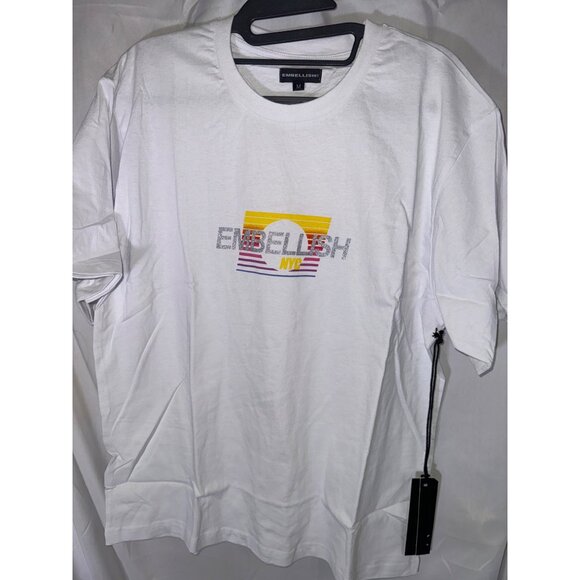 Embellish NYC Striped Skyline Logo T-Shirt is a white, size M, and new with tags. This stylish men's T-shirt features a unique design that stands out.