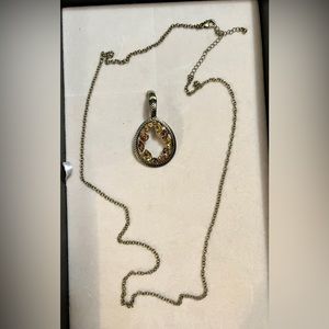 Matte brass with crystals, glass and acrylics. Very pretty. Magnetic pendant that can be used on other necklaces. Easy necklace to love!