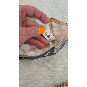 Stand out in this vibrant two-piece bikini set featuring multi-color glittery stripes, intricate woven patterns, and eye-catching hand-sewn embellishments! The bandeau-style top includes a beaded mandala centerpiece with hanging beads, while the bottom sides are accented with layered felt, sequins, and stitching details.
