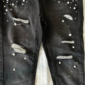 Stylish black jeans featuring pearl embellishments and a distressed design. Perfect for a chic, edgy look. Skinny/straight fit but not jegging material. Egoist is a South Korean brand. Never worn.