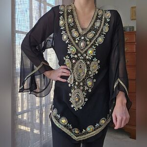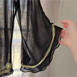 The fabulous black sheer cover up or blouse with 3/4-length, bell-shaped sleeves. It has intricate gold beading and sequins around the neckline and down the front in a geometric floral pattern. The blouse has a V-neck and is made of a lightweight, sheer fabric.