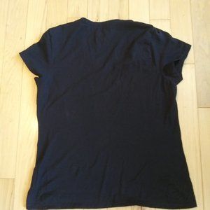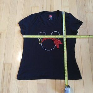 Embellished Black V neck tee Pirate/gypsy mouse. 100% cotton on a Hanes tee. Very unique design I have never seen one like this before there may be a few sequins missing from the red bandanna part and the right ear the silver sequins seem a bit wonky at the top in one place . . Measurements" armpit to armpit ~ 19" . From top of shoulder to bottom hem ~ 25". I believe this to be a juniors please refer to measurements and pics . Thank you