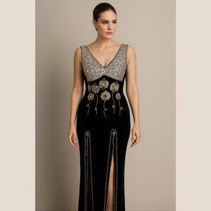 Embellished Black Velvet Gown w/ Floral Gemstones – Statement Dress (Small)