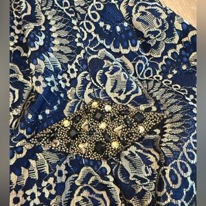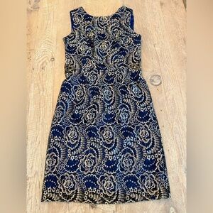 Embellished Brocade Sleeveless Sheath Dress. Blue and gold - satin lined. Size 6 Just in time for the holidays!