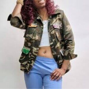 Unique styling on this camo jacket. Embellished pockets, upper arms and back of jacket. Zip and snap closure and inner tie at waist to adjust the fit. Made by Beautiful Stories. Size small measures approximately 19 inches PTP and 26 inches in overall length. Poly cotton blend. Smoke and pet-free home.
