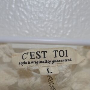 This cream blouse features a stylish cropped design with short sleeves, enhanced by delicate ruffles and embellishments. Its elegant details add a touch of sophistication to any ensemble.