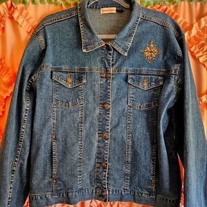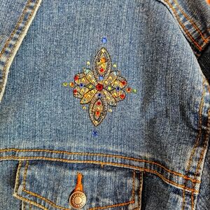 NEW NEVER WORN! Stylish denim jacket featuring a vibrant embellished cross design. Perfect for adding a touch of flair to any outfit.