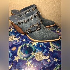 From Gianni Bini, the Walden Western Denim Rhinestone Embellished Mules feature: