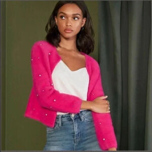Beautiful bright fuchsia cardigan with crystal embellishments. Brand new in package, never been worn. 100% Nylon, eyelet closure. Measurements: Pit to pit 21”, sleeve length 20”, shoulder to hem 20”.