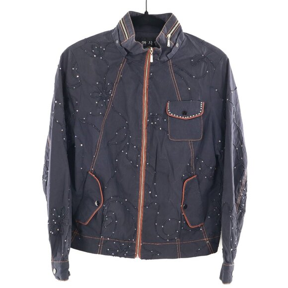 Embellished Full Zip Bomber Jacket Womens XL Navy Eclectic Dark Academia Unique