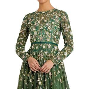 Mac Duggal is a women's luxury apparel and eveningwear fashion house founded in 1984. Mac Duggal made its mark by bringing the opulent hand-beaded designs of India to America and adding a touch of romantic-edgy modernism. A fusion of regal embroidery, daring cutouts, bold colors and traditional jeweled details native to India are what give the brand its unique approach to luxurious taste and design. Aline Sage Green with pink and white sequined flowers SO ROMANTIC