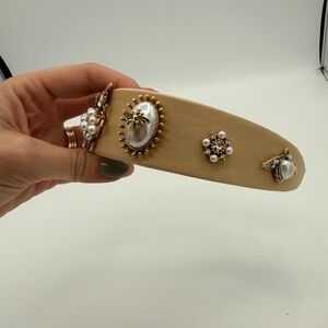 Stylish tan headband adorned with pearls and crystal embellishments. Color is a beige satin.
