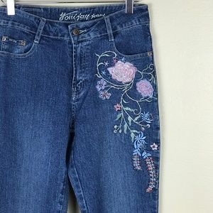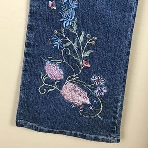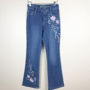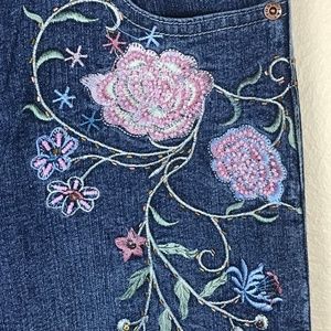 Embroidered and Embellished on trend for 2019!9. 5-inch flare leg denim hem. Yoni-Jay by Jonathan & Jacob. flair leg denim with embroidery and embellishments. Pristine condition.