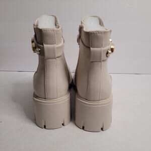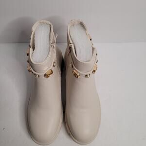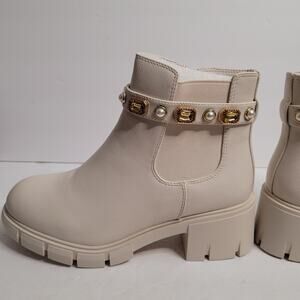 This is a women's ankle boot, likely a Chelsea-style boot, characterized by its light, possibly off-white or beige color, and a distinctive decorative strap. These Ankle boot, resembling a Chelsea boot with elastic side panels for easy wear. Features a chunky, lugged sole and a block heel, providing traction and a contemporary look.