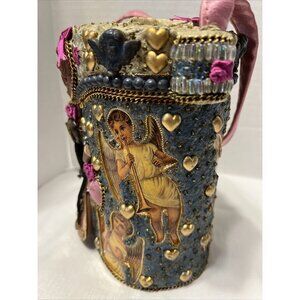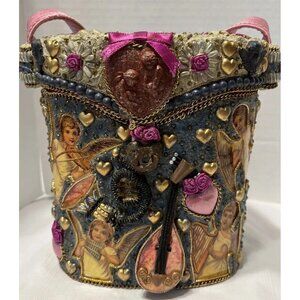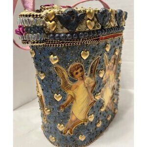 This unique mini bag features an intricate angel motif with vibrant embellishments. Perfect for adding a touch of whimsy to any outfit.