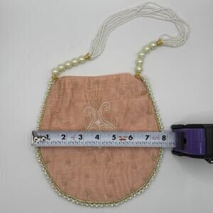 No flaws, defects, stains, rips, or tears. Very delicate and pretty! The product is an embellished peach tone Indian potli bag featuring intricate beading and faux pearls. It is a small sized bag with a top handle style and gold hardware accents. The exterior material is silk, and the design is inspired by Indian themes. This lightweight bag is perfect for special occasions like weddings and parties, adding a touch of elegance and grace to any outfit.