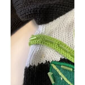 Condition: Gently Used. Please refer to the photos for details on the embellishments and overall condition. There may be some minor imperfections due to the nature of the embellishments. This cardigan is sure to make a statement! There are a couple of tiny stains - one on left chest area and one underneath right armpit but very small. Light stain at collar. Shoulder pads, hidden buttons closure.