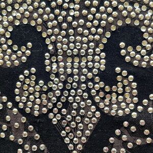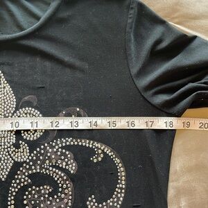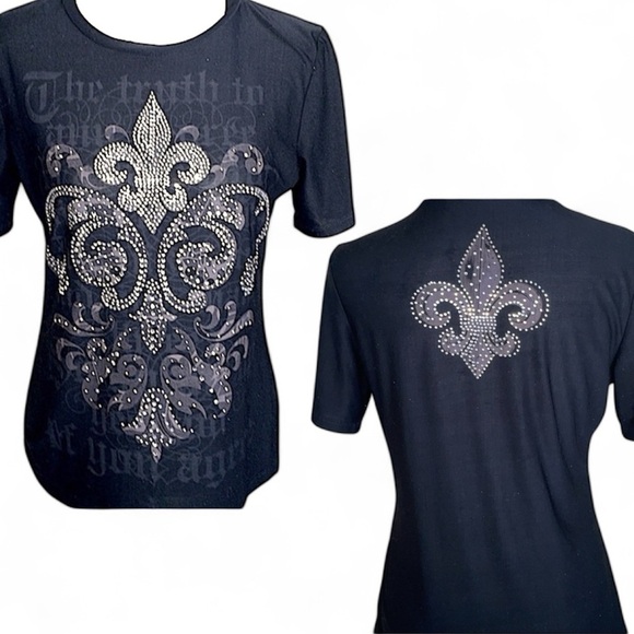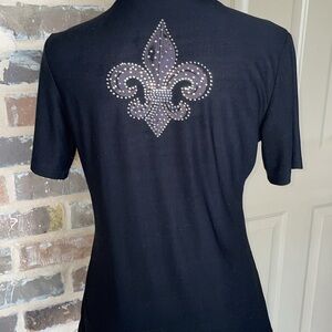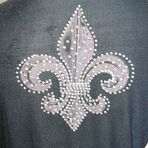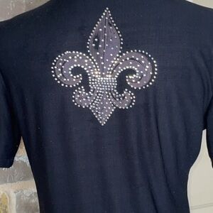 Rhinestone Fluer De Lis Fitted Top. Embellished front and back. No size tag but approximate flat measurements in photos. Fits like a small/medium. Perfect for Mardi Gras or tailgating for a Saints game in the French Quarter.