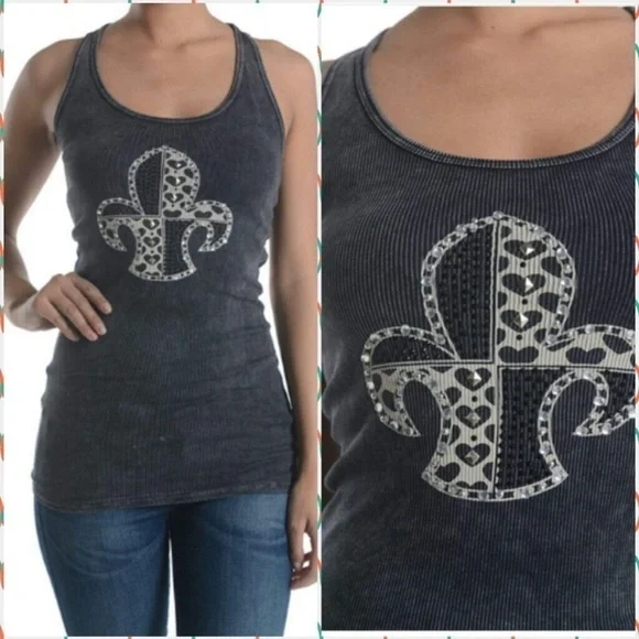 Embellished with rhinestones racer back sleeveless tank top. Black washed out/tie dye look to it. Fitted tank but it’s got a lot of stretch to give.