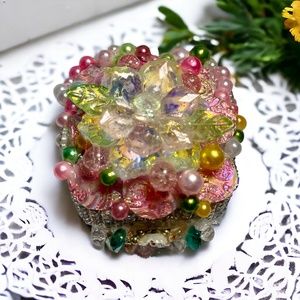 Each bead is lovingly and deliberately placed by hand, then the entire exterior is sealed with a waterproof, pearly glaze. May be cleaned with a gentle, damp cloth.