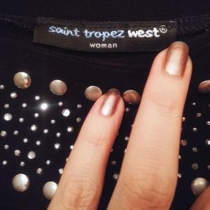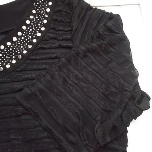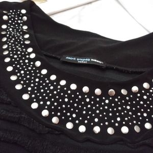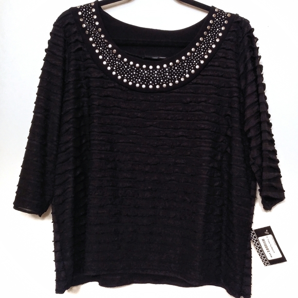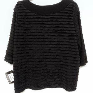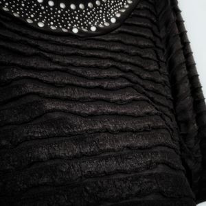 Black blouse with mini-ruffle stripes and silver embellishments. Flattering, stretchy, with 3/4 sleeves. Dress up or wear casual. Beautiful and pairs with everything.