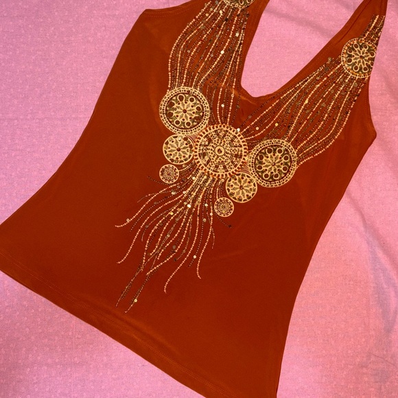 This stylish rust tank top features intricate gold embellishments, perfect for adding a touch of elegance to any outfit.