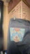 Dark blue jeans with colorful skull embellishments on back pockets. Features red, blue, and green accents.