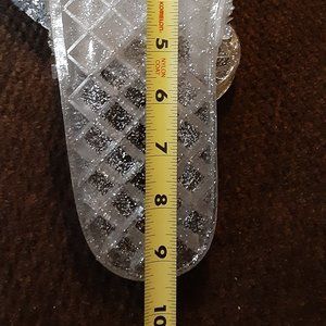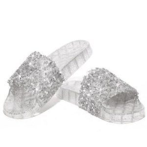 These Embellished Sparkle Slides are dripping with sparkle and bling and these jelly slides are comfy and perfect for POOL side fun or a lunch date out!!