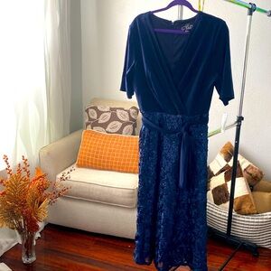This elegant evening dress has a perfectly paired look with a wrapped surplice bodice atop a lace A-line skirt textured in lustrous rosettes and glitzy sequins.
