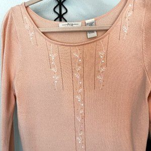 Gorgeous Pria Embellished Sweater, in Peach with very subtle shimmery tone-on-tone sequins/beads, size S. Soft fabric with a bit of stretch. Good condition. Would look great with winter white pants or skirt!