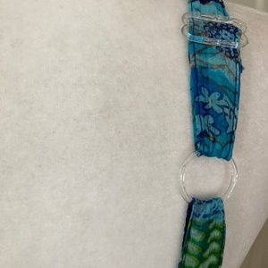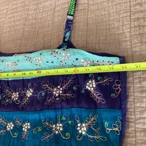 Unique top has adjustable straps. Fully lined skirt made up of purple/blue and aqua blue lace panels, alternating with printed panels of green white rust . Front has aqua, navy, and teal blue rows, each row with beautiful jewels golden thread scrolls. The back is solid blue fabric. Shell is 100% Rayon. Lining is 100% Cotton. Great condition.