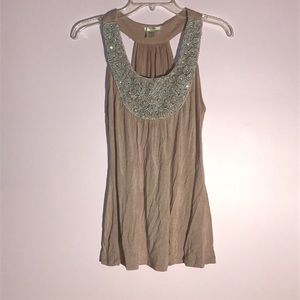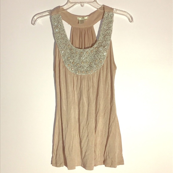 Beautiful nude colored flowy tank with beading and embroidery. Flattering scoop neckline and modest racer back. This top is sweet dressed up or down!☺️