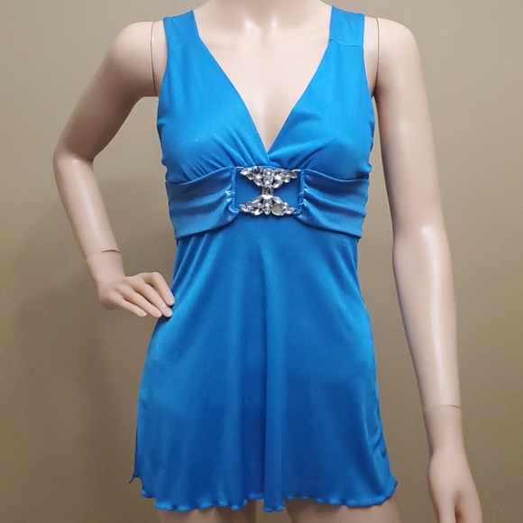 Shimmer blue top with faux crystal embellishments. Some missing stones and one small pull (pictured). Priced accordingly.