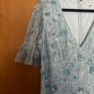 Elegant Mac Duggal dress with intricate light blue floral embellishments. Features sequins and delicate embroidery.