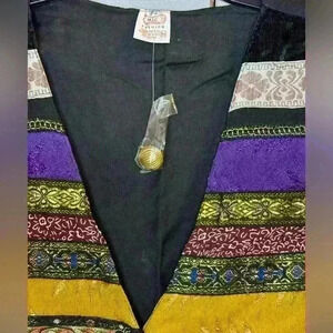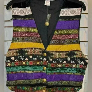 Black multi-colored vest with embroidered and mixed media in multiple colors. Dress up anything in your wardrobe including your jeans. One size. Pit-to-pit 21”. Length 21”. Easy fit.