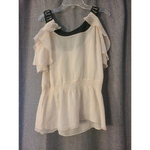 Stunning off-white Bebe top with ruffled cold shoulder sleeves and a black beaded neckline for a glam touch. Features a stretchy ruched waist and a flowy, lightweight fit. Perfect for a night out, dinner date, or party look. Super flattering and feminine.