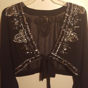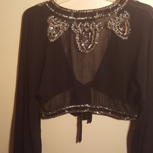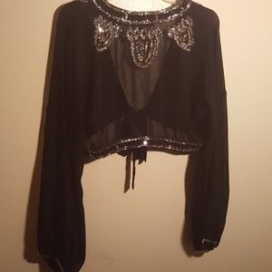 This embellished mesh going out crop top blouse is sheer long sleeve top featuring shimmering embellishments allover, a cute cropped shape and for a femme look and feel