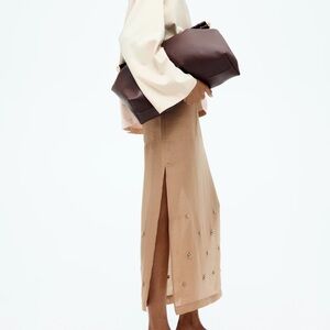 Calf-length skirt in sheer, woven fabric with shiny embellishments. High waist, shaping seams at front and back, and a concealed zipper at one side. Straight-cut hem with a high slit at sides. Lined at top.