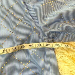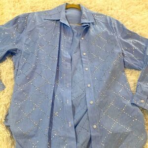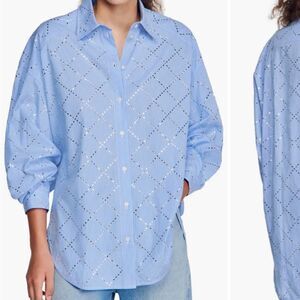 This shirt is absolutely gorgeous! I’m so hesitant to let it go but just haven’t reached for it. Im not sure if it’s the real top or a replica of the Sandro shirt that retails for $370. It’s light weight and beautiful quality! I had the real version and cant tell the difference. The only reason I’m saying it might be a replica is because there is not a Sandro tag on this. Either way it’s gorgeous and high quality! This is a size XS but fits like a medium. It’s an oversized fit.
