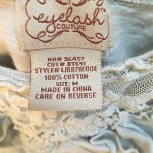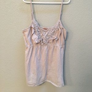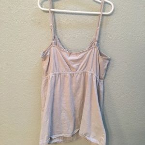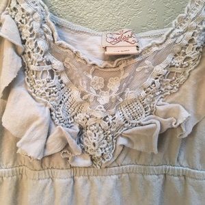 This is a great top for spring and summer! It's a light blue color with fabric embellishments around the neckline. The straps are also adjustable and it is 100% cotton.