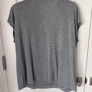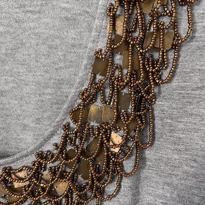 Gray cap sleeve Club Monaco tee with a very soft hand, 70% rayon, 30% lyocell. Has a low u neck with bronze colored beading with square bronze paillettes mixed in draped at neckline. Hand wash cold. Never worn.