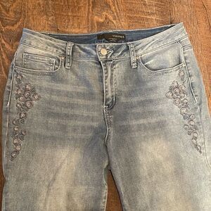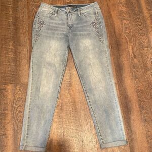 Cute light denim embellished jeans - super cute flowers. Inseam 28 inches -