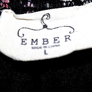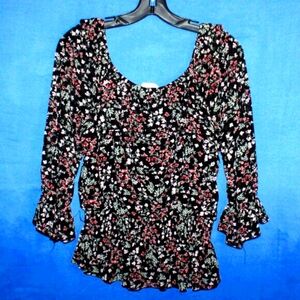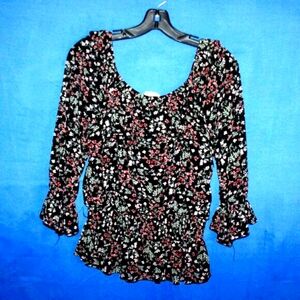 Embrace delicate charm with this beautiful Ember blouse, featuring a lovely all-over floral print in shades of pink, white, and green on a classic black background. This top is designed with a flattering wide neckline, long sleeves with playful ruffled cuffs, and a comfortable smocked waist that creates a stylish peplum hem. Made in China from 100% polyester for both the shell and lining, this size L blouse is perfect for adding a touch of feminine elegance to your spring or fall wardrobe.