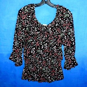 Style: Blouse, Peplum top, Smocked waist, Floral print, Long sleeve, Ruffled cuffs, Wide neckline
