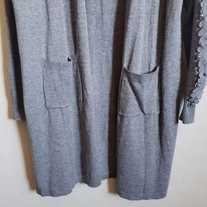Stay cozy and stylish with this elegant gray open front cardigan sweater. Perfect for layering, it features intricate detailing on the sleeves and convenient front pockets.