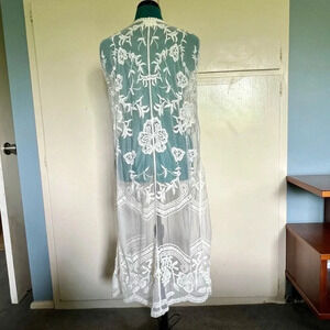 Ember sheer ivory lace sleeveless open front kimono, cardigan, duster or coverup size small.