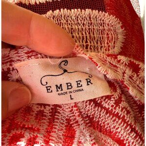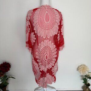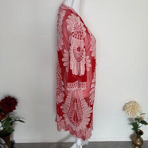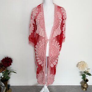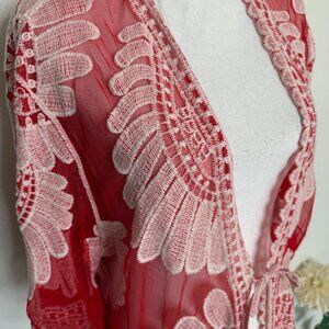 Ember Sz L Embroidered Lace Tie Front Beach Swim Resort Cover Up Sheer Red