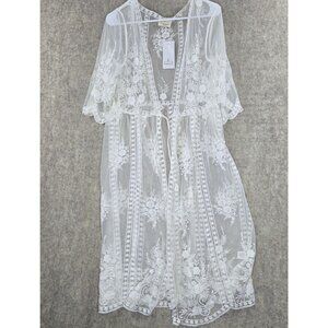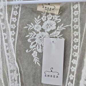 This exquisite lace kimono cardigan from Ember, with its delicate floral embroidery, offers a touch of elegance and sophistication to your wardrobe. The intricate lace pattern is both timeless and captivating, making it an ideal choice for layering. With a tie closure, it ensures a customizable fit. A versatile piece that embodies grace and charm.