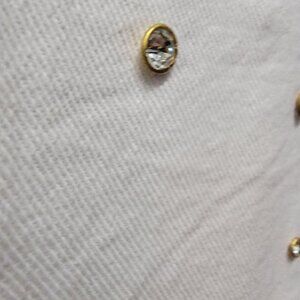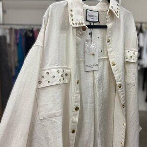 An elegant embellished white denim jacket with a refined cream undertone, designed for those who love understated glamour. This Gold & Silver Paris piece combines boho-luxe details with a modern western silhouette, featuring gold-tone studs along the collar, cuffs, and pockets. The structured yet relaxed fit makes it ideal for loungewear layering or elevated casual looks. A true designer-inspired essential, it embodies timeless sophistication and versatility — effortlessly chic from day to night.