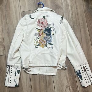 Cream colored bomber, faux, leather jacket with in bordered floral, print rivets line. The front and sleeves sleeves are zip the front zips and has one zip front pocket. The back is fully in bordered as well. Brand new worn once